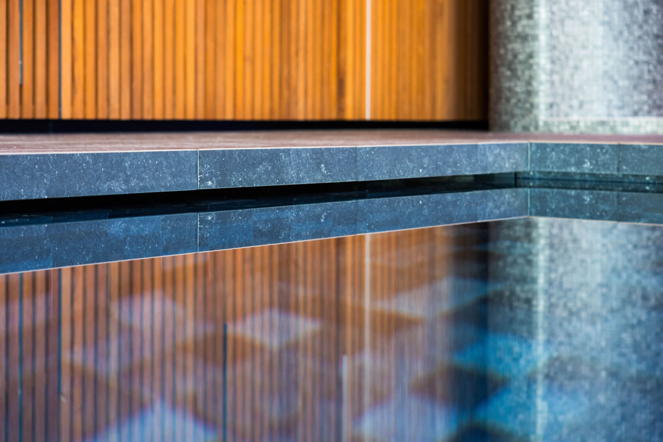 - Ligne d’eau en céramique suspendue, intégrée discrètement sous la margelle dans un tiroir en PVC anthracite.